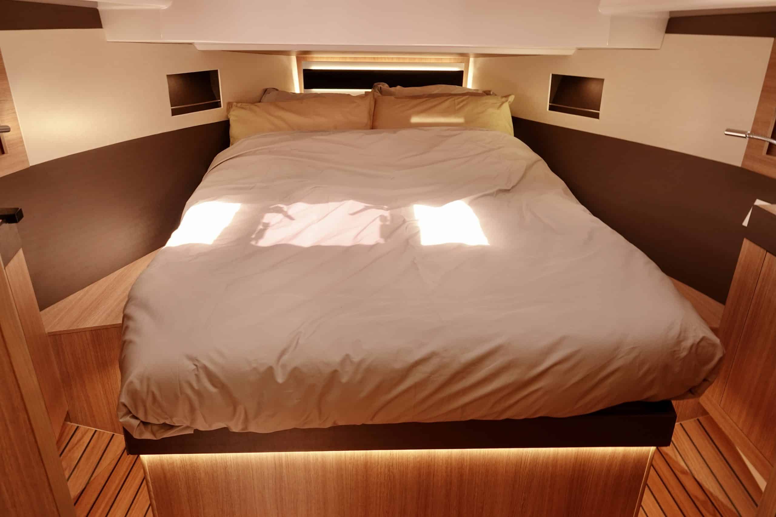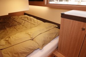 Below decks holds up 3 cabins for two persons, 2 bathrooms with each a toilet, sink, and shower.