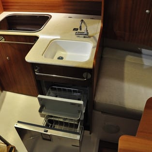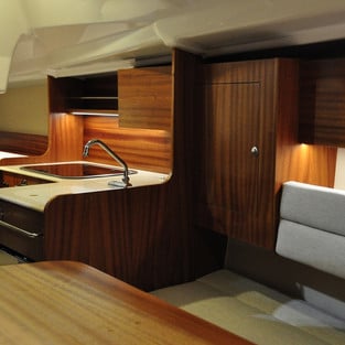 The moment you step inside, you experience its spaciousness. The well thought-through design of the Maxus Evo 24 offers a lot of comfort. Next to the standing height in the cabin, the sailboat features 4 fixed berths, a spacious table with comfortable sofas, a toilet cabin with sink and an optional shower. The Maxus Evo 24 also has a kitchen with cooking plate, sink, and plenty of storage space, optionally there is a refrigerator available. All these features makes the Maxus Evo 24 ideal as a day sailor, weekender or tour sailor. Would you like to get an impression? Watch the walkaround video of the Maxus Evo 24.
