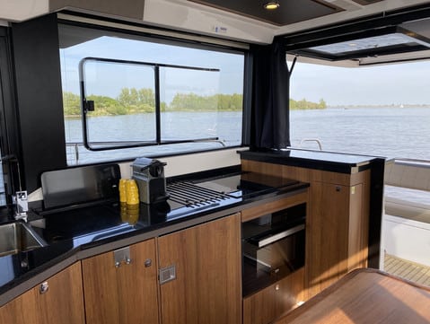 As a water sport enthusiast, you want to enjoy the full 'being on the water' experience. Even when you are inside, you still want to experience 'the outside'. The Northman 1200 is equipped in such a way that the steering position, the saloon and the kitchen all provide a view. The 'superstructure' consists almost entirely of windows. This ensures maximum enjoyment of nature and panoramic views of the water while boating, cooking or dining.